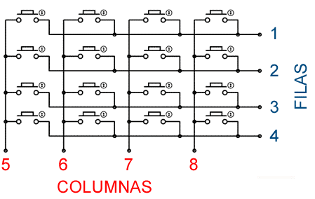 Como hemos dicho, un teclado matricial agrupa los pulsadores en filas y columnas formando una matriz, lo que permite emplear un número menor de conductores para determinar la pulsación de las teclas.