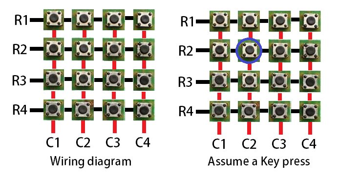 Progresivamente ponemos una fila a 0V, y leemos las entradas de la columna. Una vez realizada la lectura volvemos a ponerla a 5V, pasamos a la siguiente fila, y volvemos a realizar el progreso hasta recorrer todas las filas.