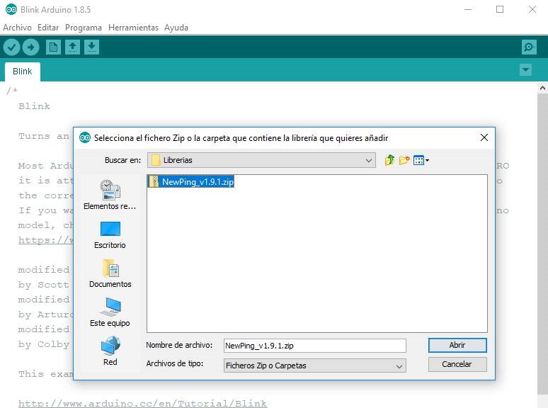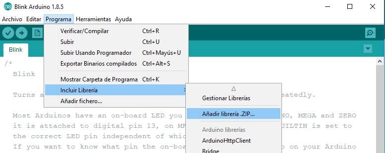 2.- Abrir el IDE de Arduino y hacer click en Programa > Incluir librería… > Añadir librería .ZIP en la barra de menú.